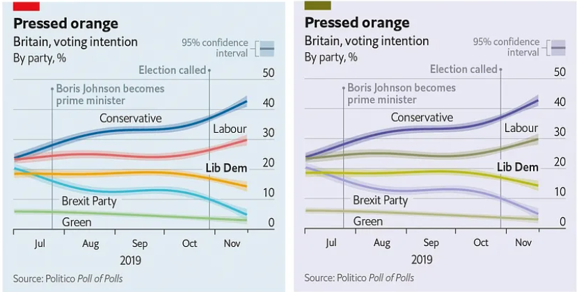 The Economist는 빨간색과 청록색 조합을 사용하여 색맹에게도 잘 보이도록 했습니다.