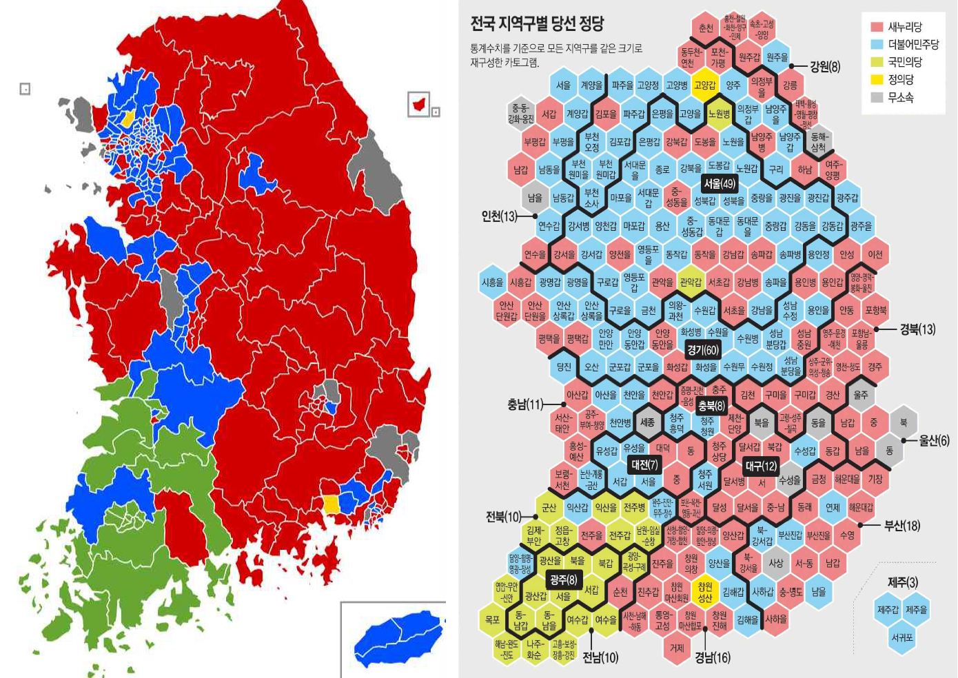 ![]() 지도 기준으로 만든 20대 총선 결과 / 의석수 단위로 재편한 20대 총선 결과 |