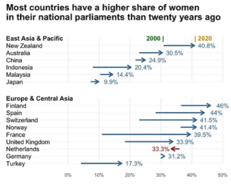 점으로 각 국가의 특정 시점을 표시하고, 선분으로 변화의 궤적을 시각화합니다