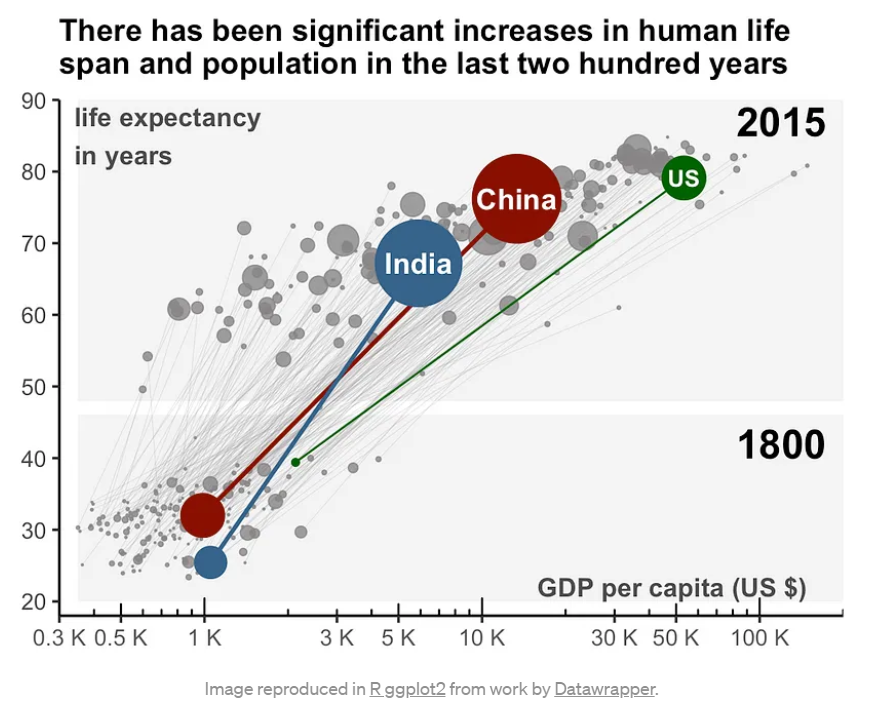 예를 들어, 국가별 기대수명, 인구, GDP 등의 1800년과 2015년 데이터를 비교할 때 유용합니다.