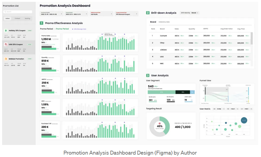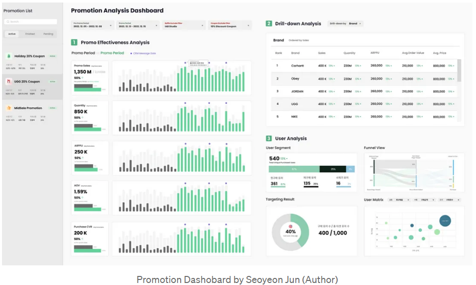 - 예: 제품 카테고리, 브랜드, 프로모션 캠페인별 판매 성과 분석 대시보드