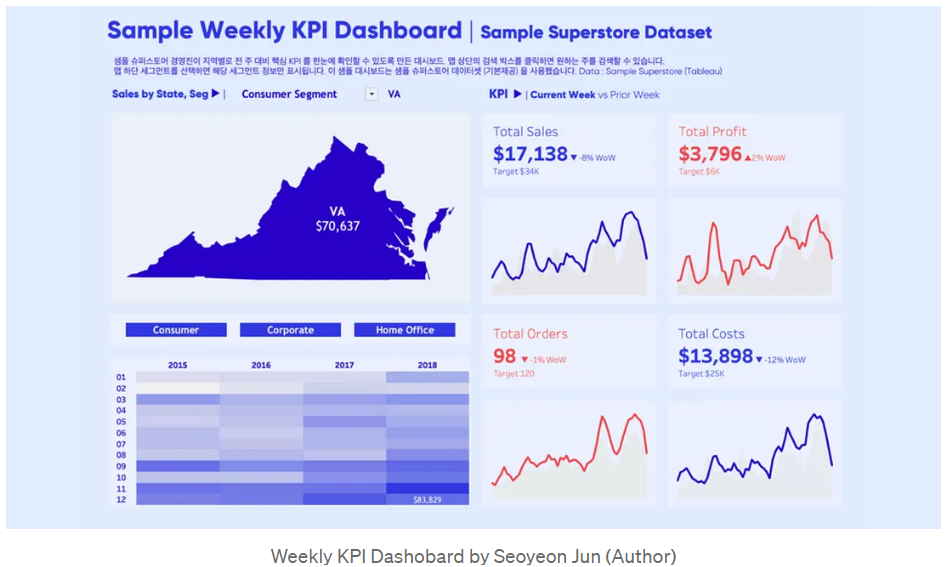 - 예: 지역별 판매 실적, 이익률, 판매 목표 등을 보여주는 대시보드