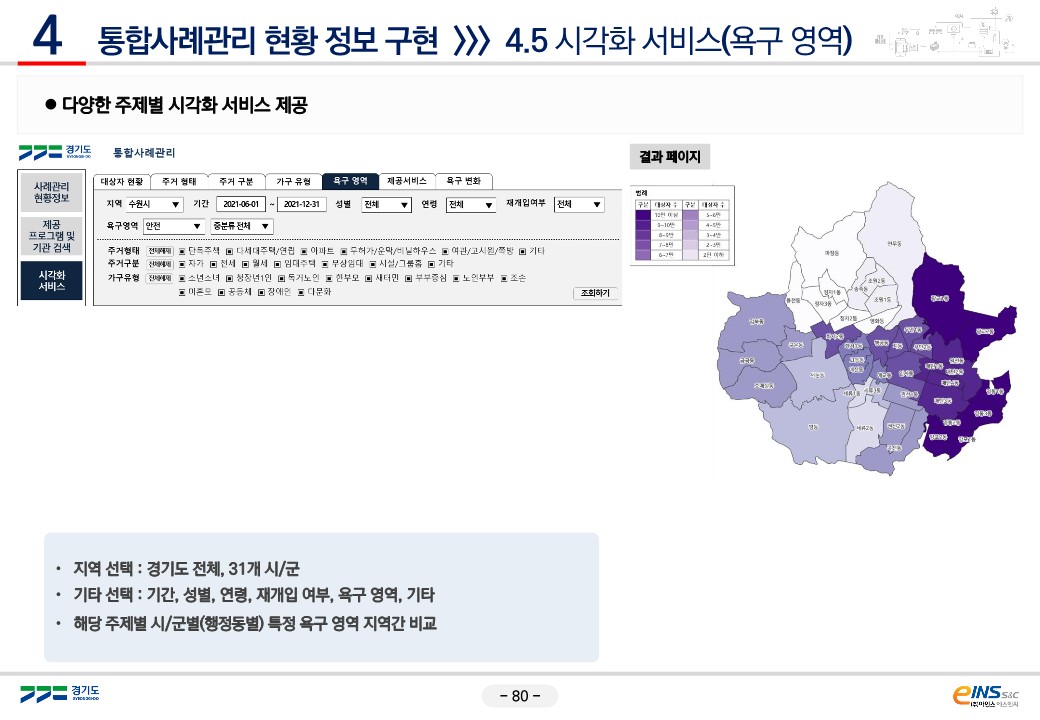 시군별, 기간별 사례관리 대상자의 욕구 영역, 제공 서비스 현황을 표와 그래프 형태로 제공하고 있습니다