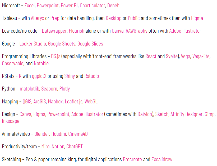 In this post I share several sections of useful resources that may help you find out what data visualisation tools are available, are being used, and what they are capable of in terms of charting features.
