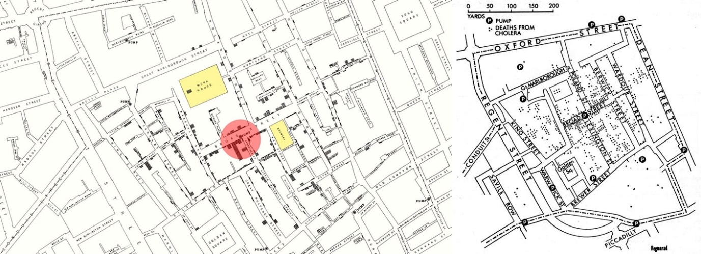 [좌] 노란색으로 표시된 양조장과 작업실. 빨간색은 가장 많이 감염된 지역과 주요 펌프장의 위치를 나타낸다.[우] 존 스노우가 제작한 1854년 8월 19일부터 9월 30일까지 도심 내 콜레라 집단을 발병도를 보여주는 지도. 존 스노우, 콜레라의 전파 방식을 나타내는 이미지, 2판. 런던: 존 처칠, 1855년 발행.