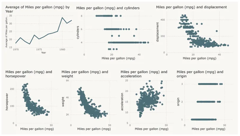 이 차트들을 통해 실린더 수가 많은 자동차는 연비가 낮고, 배기량이 작을수록,